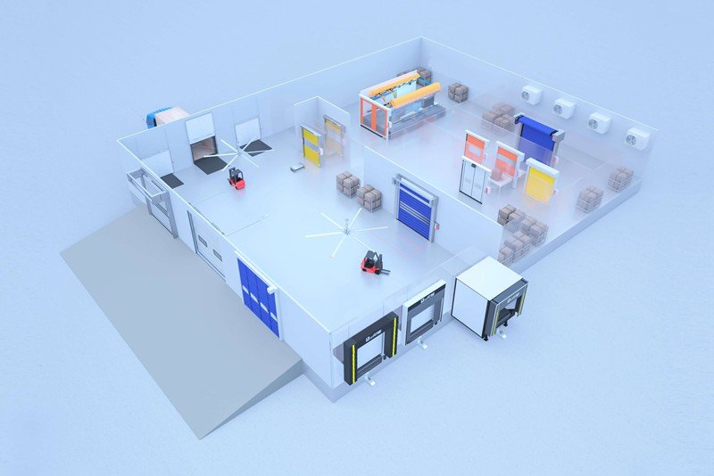 Food processing environments require high standards of hygiene. Industrial doors should provide effective protection against insects and dust while maintaining a clean production area. Yellow PVC door curtains are commonly recommended to help reduce insect attraction, and the doors can be integrated with air curtain systems for better environmental control.