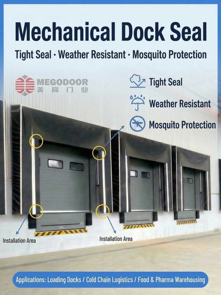 In modern logistics warehouses, factory loading bays, and distribution centers, the sealing performance of the loading area directly affects working conditions, cargo protection, and loading efficiency. As a supplier of industrial doors and loading bay solutions, Megodoor provides practical, stable, and customizable Mechanical Dock Shelter solutions to help improve dock sealing performance and optimize the overall loading environment.